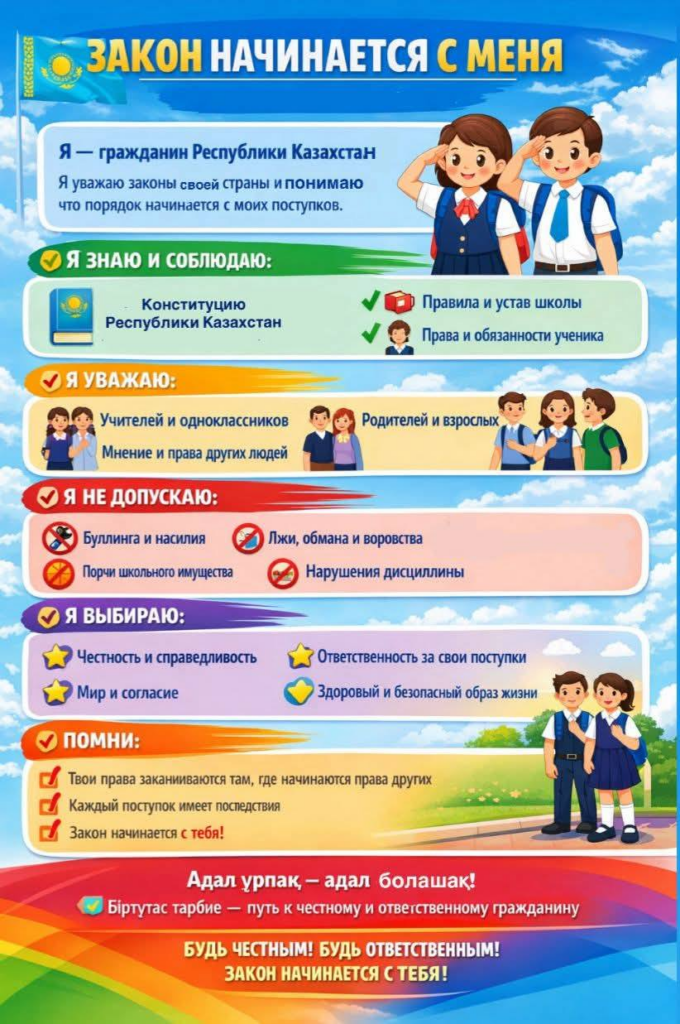 7. В рамках плана месячника «Закон и порядок» единой программы воспитания «Адал Азамат» в нашей школе прошёл день «Честность и справедливость» в дистанционном формате.
