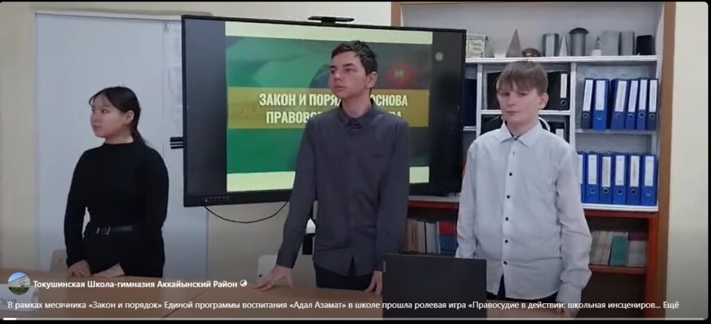 3. В рамках месячника «Закон и порядок» Единой программы воспитания «Адал Азамат» в школе прошла ролевая игра «Правосудие в действии: школьная инсценировка судебного процесса», подготовленная учащимися 8 «А» класса, под руководством учителя истории Баймакановой А. С.