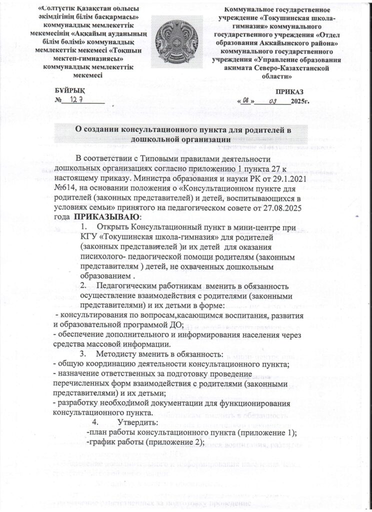На базе Мини-центра при КГУ «Токушинская школа-гимназия» функционирует БЕСПЛАТНЫЙ КОНСУЛЬТАТИВНЫЙ ПУНКТ для родителей (законных представителей) детей в возрасте от 2 до 5 лет, не посещающих дошкольную организацию.